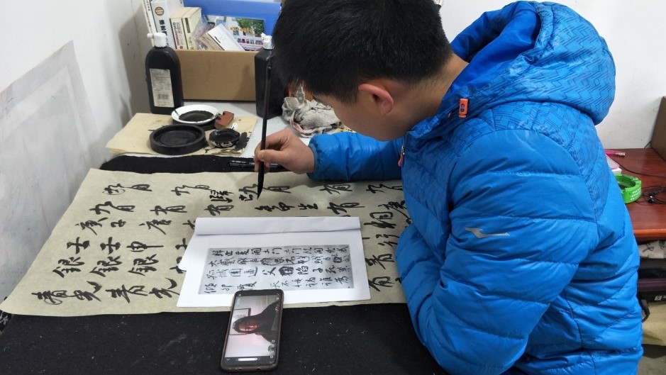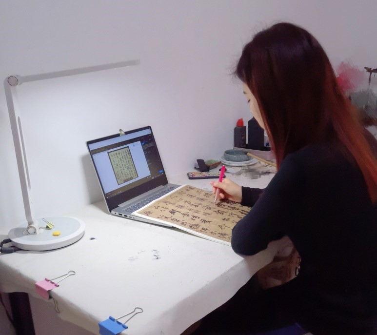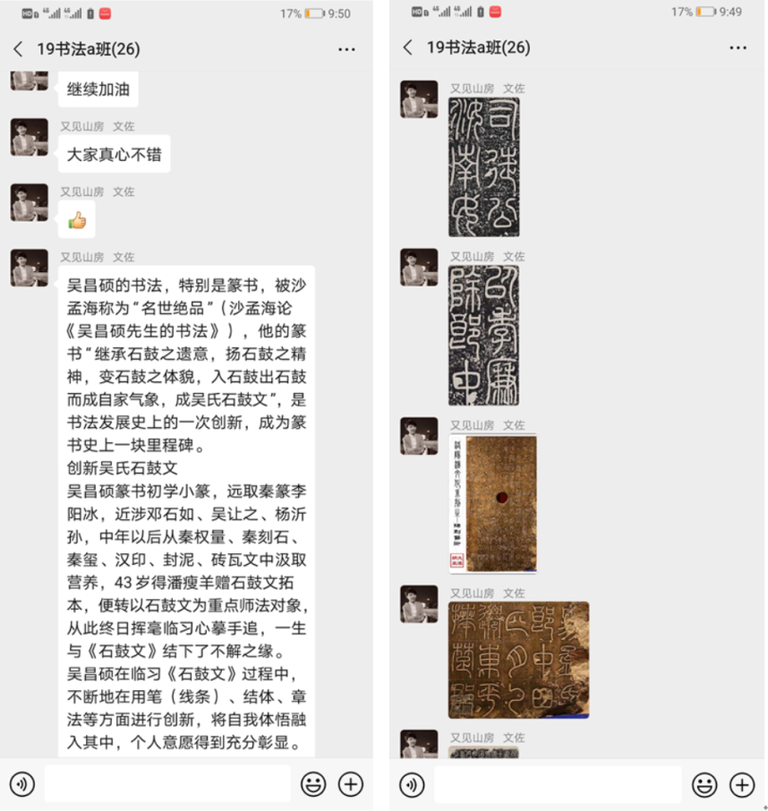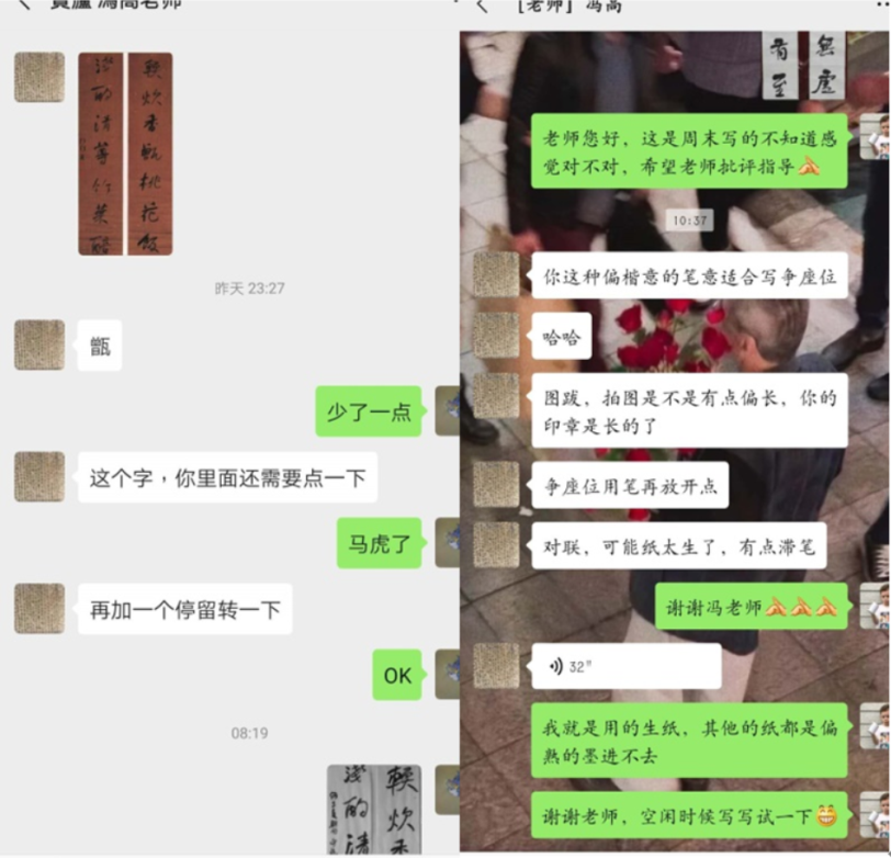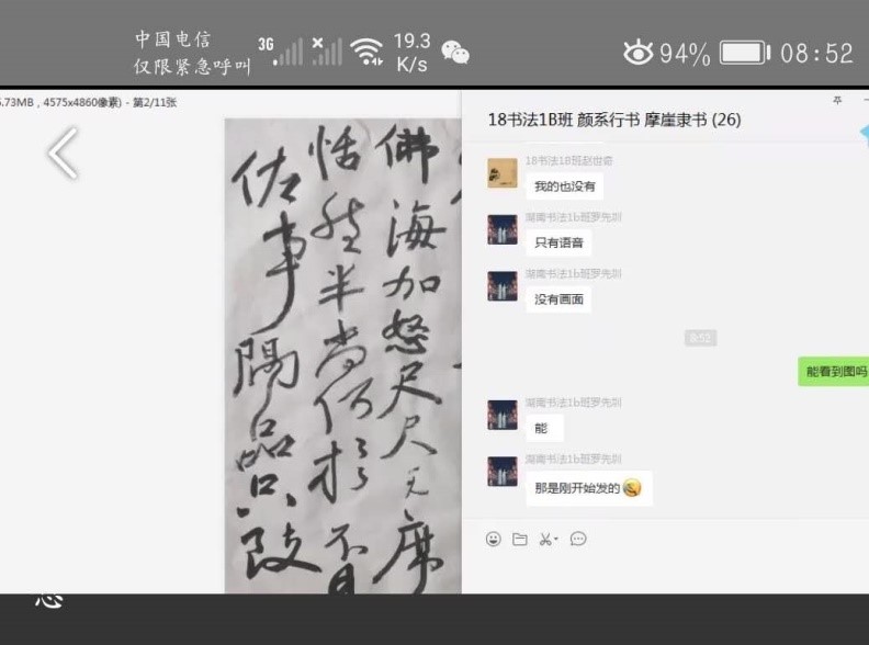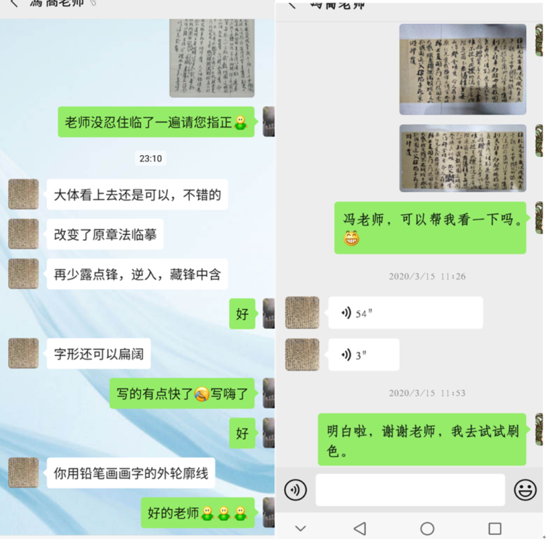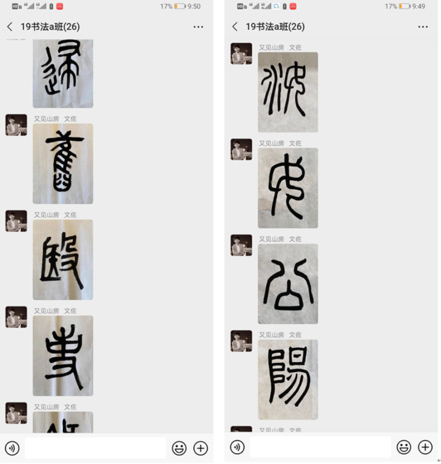 书法专业课程的教学需要将教师示范讲解更直观地呈现给员工,从冯高、文佐两位老师详细精彩的教学过程可知,老师们将书法教学专业的特点与线上教学优势有机结合,有效发挥老师直观示范的延时性,有利于员工的反复学习。教师对员工作业的逐一指导虽然比平时教学花费了更多的时间,但也获得了更加精准的有效指导。因此线上授课虽有弊端,只要因势利导,用其所长,也能获得比日常教学更好的教学效果。书法专业的其他老师也同样积极利用各种教学平台、录制示范视频这种方式来辅助员工们进行书写练习,均得到了较好的评价与反馈。疫情防控期间,我们积极面对教学方式的转变,转“危”为“机”,更好地利用各种信息技术手段保障教学秩序、保证教学质量,让网络教学展现出特殊时期的蓬勃活力。