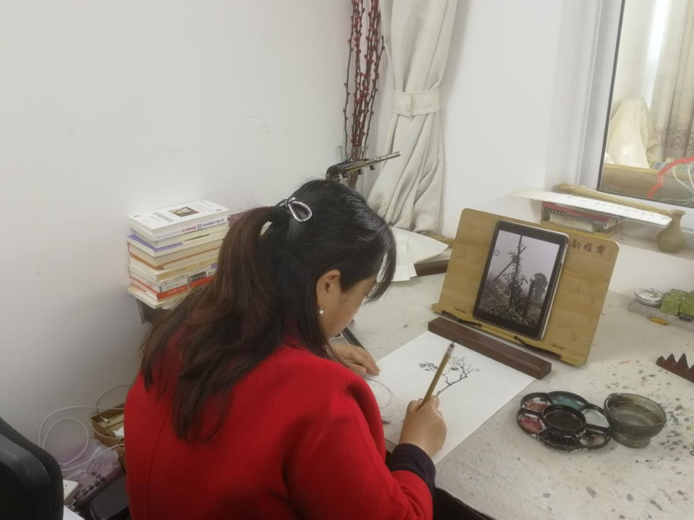 “首先,课前录制多个理论知识点讲解视频,课上用QQ群进行分享,员工自主学习。其次,用QQ群课堂直播的形式演示笔墨技法。然后,让员工分享自己拍的家乡美景,并参考照片进行写生。最后,在QQ群内点评作业和互动答疑。”