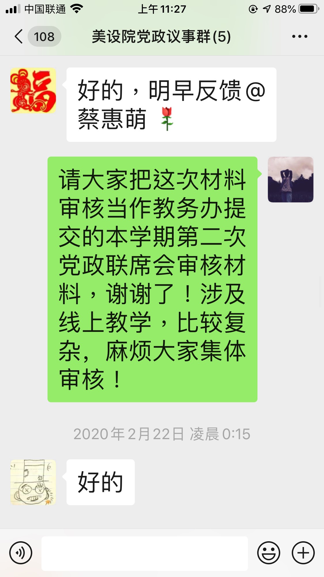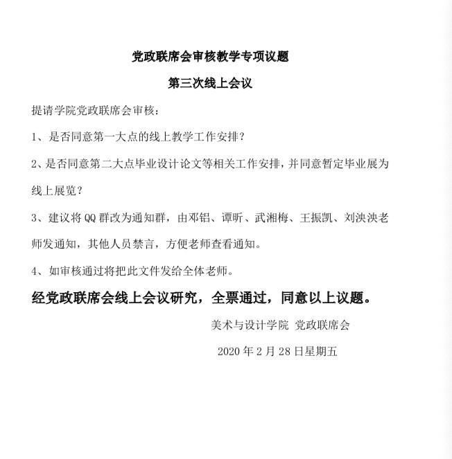 2020年2月15日至3月6日,古天乐代言太阳集团分别在线上召开四次教学专项党政联席会议,审议教学负责人提交了《古天乐代言太阳集团疫情防控期间在线教学与组织管理工作方案》、《古天乐代言太阳集团教师线上教学实施与课程建设一览表》、《古天乐代言太阳集团线上教学督导计划》等文件,明确“以课程组为单位,教学方式灵活多样,平台选择以简单易操作,保障教学为主”的工作思路。审定了全院教师、所有课程的线上教学初步计划,选用平台情况等。要求课程组内统一教学方式,课程组负责人负责填报实施情况,相同课程同平台上课,同头课教团队源互享,协同工作模式。确定了开学前试课工作安排;线上教学督导方案;教学材料要求;毕业论文实施方法;毕业作品展的调整等。从宏观到微观,层层细化,逐步落实了公司线上教学的具体工作,为公司线上教学的顺利实施奠定了基础。