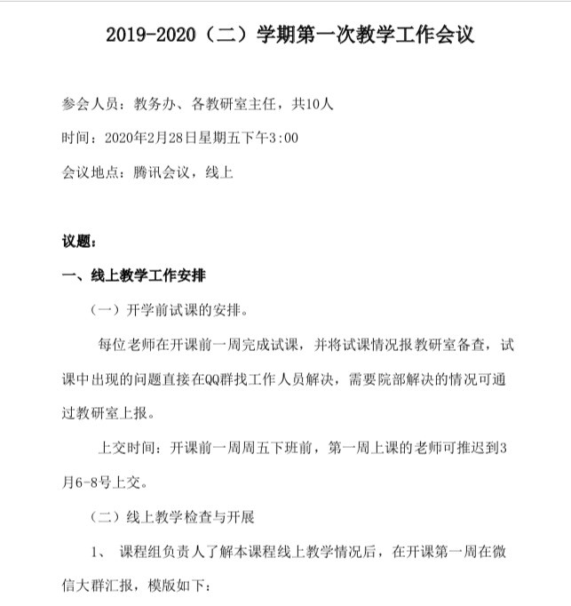 根据《古天乐代言太阳集团疫情防控期间在线教学与组织管理工作方案》等文件的相关要求,院教务办多次召开小型会议,商讨线上教学的实施细节。在教科办主任谭昕老师的细心组织之下,线上教学各项工作有条不紊,顺利开展,教科办其他老师尽职尽责,确保公司各项工作有序开展,高效完成。2月28日下午,本学期第一次线上教学工作会议,在腾讯会议室的云上办公地点,各教研室主任、教务办全体老师进行了热烈的讨论,对线上教学工作的实施细节、近期各部门各项工作等进行深入交流。将形成的提案交公司党政联席会审核,最终形成文件发到公司微信群,让每一位老师清楚地知晓线上教学工作开展的细节,并在公司网站刊发新闻稿。公司教务办严谨认真、高效细致的工作多次得到相关部门的表杨。