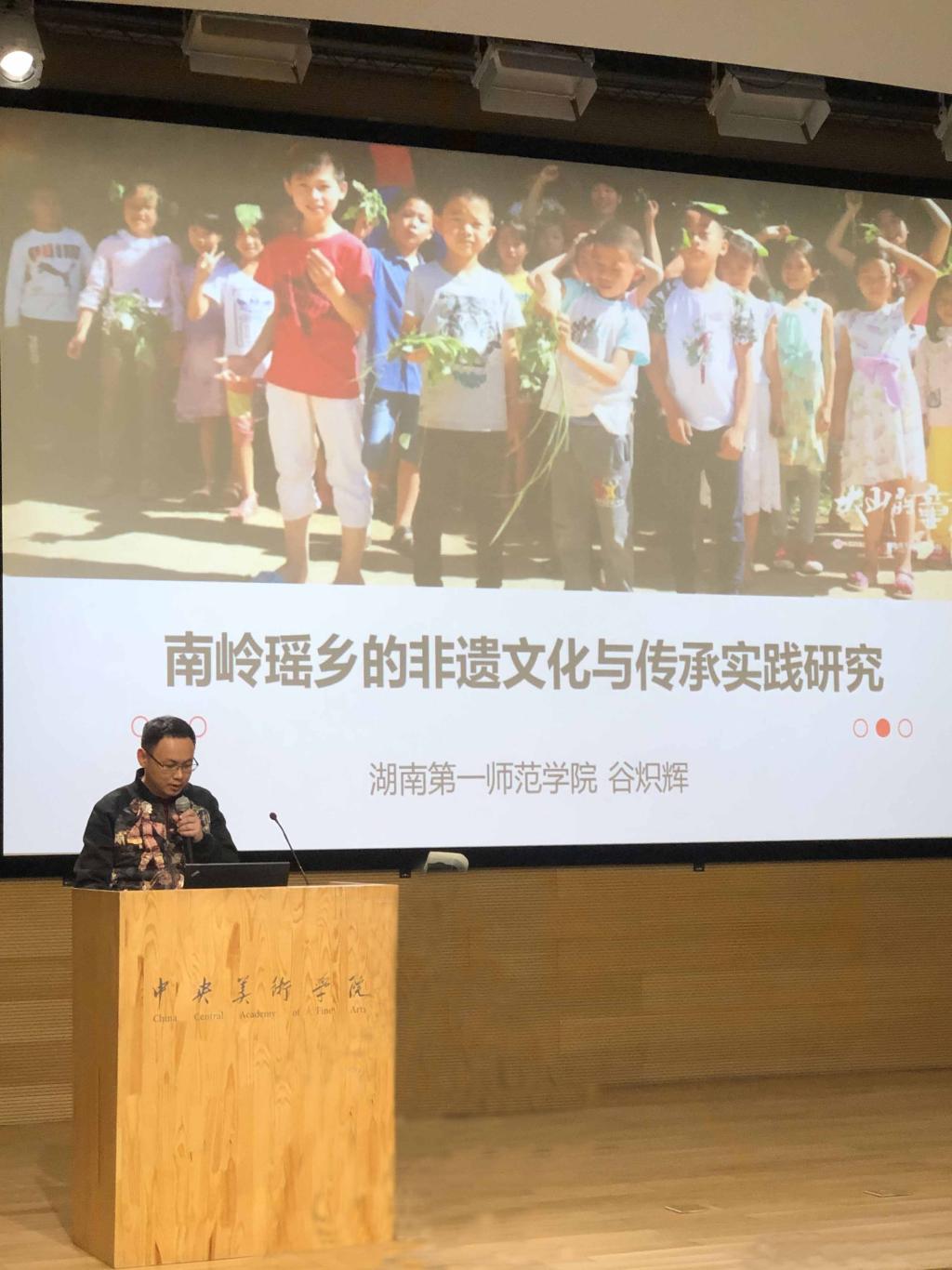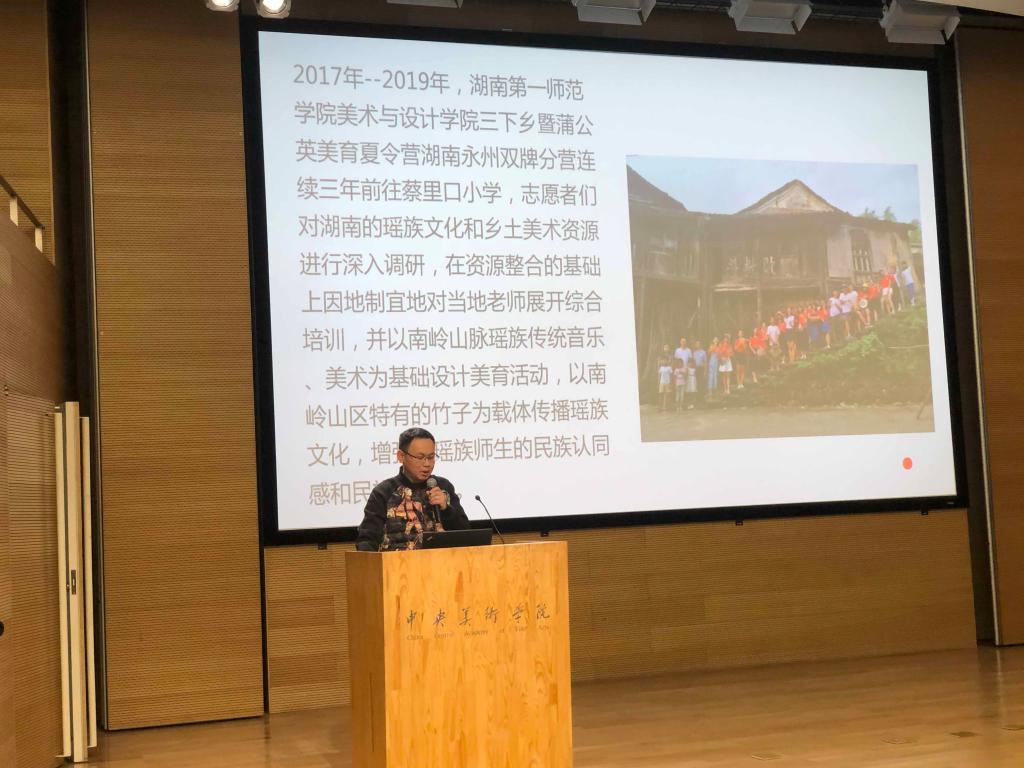 谷炽辉老师介绍导师工作坊工作成果并进行“南岭瑶乡的非遗文化与传承实践研究”主题演讲。主题演讲汇报了古天乐代言太阳集团持续三年在湖南省双牌县蔡里口小学开展的美育夏令营的工作情况,从用教育的方法促进瑶族文化在瑶族农村地区的传承和发展、将瑶族民间文化引入美术课堂和寻找资源为我所用、扩大活动影响力三个方面展开,最后提出因为美育夏令营等各方面的共同努力,一所湖南和广西交界的偏远村小在2019年9月10日获得了国家教育部“全国教育系统先进集体”的荣誉称号,引起了与会者的广泛兴趣,得到了他们的高度赞誉。他们一致认为,美育夏令营很有成效,向孩子们传承了丰富的民间美术知识,促进了教育公平,为基层乡村教师培训了美育能力,提升了校园环境,南岭瑶乡的非遗文化得到了较好的保护和传承。
