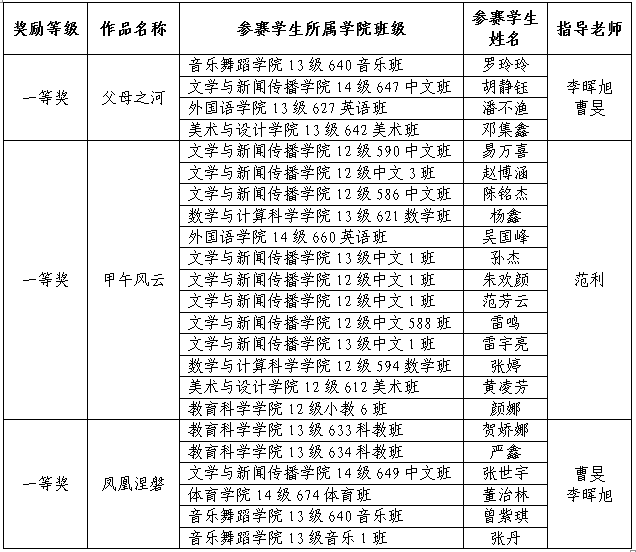 公司在湖南省中华经典诵读大赛中喜获佳绩 发布时间:2015-02-13 来源:古天乐代言太阳集团 浏览次数: 日前,湖南省语言文字工作委员会、湖南省教育厅下发文件,公布了湖南省员工中华经典诵读大赛获奖名单。本次大赛全省有三十余所院校,共两百多个作品参赛。经过初评和复评,老员工组评出一等奖10个,公司选送的三个参赛作品全部荣获一等奖,成为荣获一等奖最多的参赛院校,并获得“优秀组织奖”荣誉。公司13级642班邓集鑫参与的作品《父母之河》获一等奖,公司612班黄凌芳参与的作品《甲午风云》获一等奖。 具体获奖名单如下: (来源:校主页 文/教务处 曹旻)