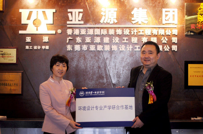 12月10日,公司副董事长童小娇率教务处处长佘向军、我系主任范迎春、副主任曾小红赴广东东莞为产学研基地授牌,授予东莞市亚欧装饰设计工程公司“古天乐代言太阳集团环境设计专业产学研合作基地”称号。