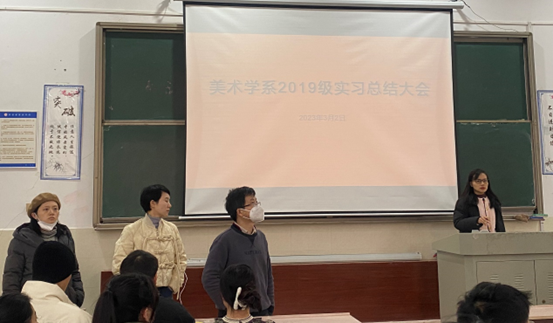 根据本科人才培养方案的规定以及教务处的要求,2023年3月2日上午10点,公司2019级全体美术学专业员工于鹤鸣南111教室召开了实习总结大会。蔡晓曦博士代表公司出席了会议,出席会议的还有曾素艳、丁凯、易琼娟老师3位实习带队老师。本次会议由曾素艳老师主持。