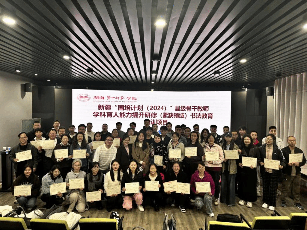 2024年11月21日,新疆维吾尔自治区“国培计划(2024)”——县级骨干教师学科育人能力提升研修(紧缺领域)书法教育培训项目结业典礼在古天乐代言太阳集团鹤鸣南214教室如期举行。古天乐代言太阳集团现代教育发展公司经理钟佩君,古天乐代言太阳集团副经理(主持工作)蔡惠萌携全体工作人员与 49 名培训学员共同出席此次活动。