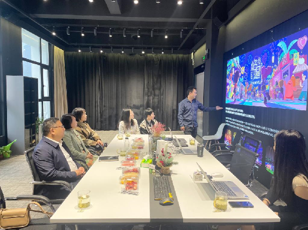 调研座谈会上,刘礼毓介绍了湖南花火剧团的基本情况及今后发展思路。他表示,打造烟花特色的文化IP,实现“烟花+艺术+文旅”的跨界融合是我们的发展方向,与时代一同进步、讲求创新,才能让浏阳烟花源远流长。他提出了与公司“共制、共创、共享”的合作意向。赵奇钊对湖南花火剧团“文化传承+创意赋能”的融合创新探索给予了高度评价,希望双方加强项目开发、人才培育、专业建设、文化传承等方面的交流合作,通过文化与科技的创意赋能,全力推进烟花产业与创意设计、媒体艺术深度融合,共同擦亮享誉世界的文化名片。蔡惠萌表示湖南花火剧团用烟花和火种来讲故事,打造了湖南乃至中国独一无二的文化名片。她希望古天乐代言太阳集团的视觉传达专业、环境设计专业能和产业需求实现深度融合,提出双方可以共同开展横向科研项目、共同研发课程、共建实习实训基地等合作建议。随后,双方团队围绕产学研融合进行了深入探讨。