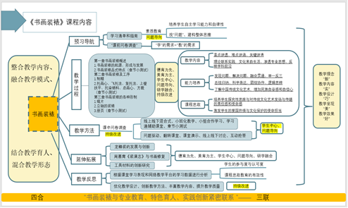 课程基于“建构性教学观”构建了“整合教学内容、融合教学模式、结合教学育人、混合教学形态”的“四合”创新举措,实现书画装裱与专业教育、特色育人、实践创新紧密联系的“三联”目标。