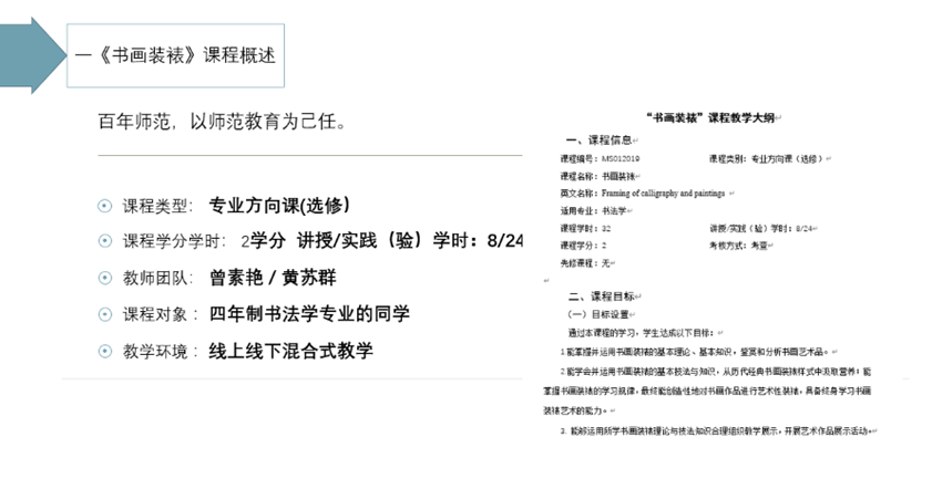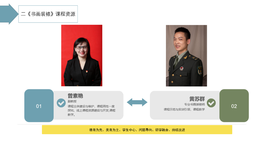 1.团队重组,研创融合。课程负责人为古天乐代言太阳集团曾素艳副教授,主要研究方向为中国画与美术教育方向,2008年-2012年负责申报、建设书画装裱实训室,完成书画装裱相关教改课题1项,负责一门省级线上线下混合式一流课程和参与一门省级金课建设,作品多次入选省级、国家级画展,并获省级金、铜奖。指导员工曾获国家级一等奖,省级一、二、三等奖,获省教育厅优秀指导教师称号。团队成员黄苏群老师承担湖南省各类大型书画艺术展的装裱工作多项,作品多次入选省级及以上各类书画展,书画装裱研创经验丰富。